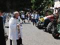 Anschließend begab sich Pater Ignatius zu jedem der Traktoren, segnete diese und die dazu gehörigen Besatzungen. Der ganzen Segnung haftete irgendwie etwas Leichtes, Beschwingtes an, alle waren gut drauf und bestens gelaunt. Pater Ignatius nahm sich auch noch die Zeit, zwei schwarze Mischlingshunde zu segnen, indem er die Beiden mit kühlem Weihwasser aus dem Aspergill besprenkelte, was denen bei der Hitze anscheinend sehr gut tat. Als sich die Steinebacher wieder auf den Nachhauseweg machten und sich die Versammlung allmählich auflöste, ging oder fuhr jeder sehr zufrieden seines Weges. Alle freuen sich auf die Jubiläumssegnung im nächsten Jahr, dann trifft man sich zum 10. Mal in der Abtei Marienstatt.