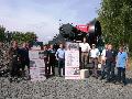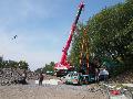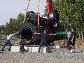 Trotz unwegsamen Geländes pirschte der Tieflader über Schotterpisten herbei. Das abschüssige Gelände stellte ein größeres Problem für den Kranwagen dar und dessen Stützen. Aber hier wusste Heinz Kempf spontan Abhilfe zu leisten. Er holte schnell einen Radlader herbei, mit dem er Erde unter die Kranwagenstützen schob. Denn Philipp Lamboy (Stockum-Püschen) hatte schon im Vorfeld Betonsockel als Fundament für die Dampfmaschine installiert, der Erdaushub, der dabei abfiel, leistete nun gute Dienste.