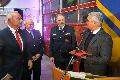 Staatsminister Roger Lewentz zeigte sich sehr zufrieden mit der schnellen Beschaffung der neuen Drehleiter, das sei auch nur gegangen, weil alle Verantwortlichen relativ unbürokratisch gehandelt hätten. Im Verlauf der weiteren Rede stellte der Minister die ehrenamtliche Tätigkeit der Kameraden der Feuerwehren in den Mittelpunkt. Er bezeichnete ihr Engagement als Dienst an der Allgemeinheit, den man nicht hoch genug bewerten könne, wobei auf sehr viel Freizeit verzichtet würde. Roger Lewentz überreichte sodann Klaus Groß, dem Wehrleiter der VG Bad Marienberg, den Fahrzeugschlüssel für die Drehleiter. Von Bürgermeister Andreas Heidrich wurde noch symbolisch ein überdimensionierter Fahrzeugschlüssel an den Wehrleiter überreicht. Danach wurden die Rolltore des Gerätehauses geöffnet, somit konnten alle Besucher das neue Fahrzeug bestaunen, welches festlich illuminiert zu bestaunen war. Es folgten Grußworte von Landrat Achim Schwickert und Wehrleiter Klaus Groß, wobei der Landrat ebenfalls den Stellenwert der Feuerwehren stark betonte und dabei weiterhin die bestmögliche finanzielle Unterstützung des Kreises zusagte. Wehrleiter Klaus Groß war naturgemäß auch sehr glücklich und erläuterte eingehend die technischen Daten der Drehleiter. Das tat er so überzeugend, dass Jürgen Theuring von der Herstellerfirma Rosenbauer aus Karlsruhe später meinte, wenn Klaus Groß mal einen anderen Job suche, könne er sofort bei der Firma Rosenbauer anfangen.