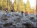 Im Landesforst Rheinland-Pfalz, Abteilung 68, oberhalb des Nisterparkplatzes, ehemals Marienstatter Abteiwald, wurde ein Fichtenbestand gerodet, der vom Borkenkäfer befallen gewesen war. Kleine „Klumpen“, überwiegend aus natürlich gewachsenen jungen Buchen, blieben erhalten. Aus den genannten Gründen hat sich Förster Andreas Schäfer für heimische Arten entschieden: Elsbeere, Esskastanie, Spitzahorn und Baumhasel, jeweils 50 Stück, wurden in Gruppen zu 25 Bäumchen gepflanzt. Das Werkzeug der Schüler war die Wiedehopfhacke: Eine Seite zum Abtrennen von störenden Brombeerranken und kleineren Wurzeln, die andere Seite zum Ausheben der Pflanzgrube. Bäumchen rein, mit fein zerkrümeltem Boden wieder auffüllen, antreten, die Festigkeitsprobe machen – fertig. Weder Temperaturen um den Gefrierpunkt noch der etwa zwei Zentimeter tief gefrorene Boden konnten den Pflanzeifer der jungen Mitarbeiter bremsen.