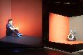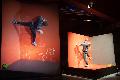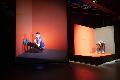 Nach der Pause zog Beate Macht ein weiteres Highlight aus der Wundertüte, den Wall Clown Tobias Wegner, der mit seiner besonderen Show erst fünf Mal in Deutschland aufgetreten ist. Er überwindet die Schwerkraft, indem seine Bewegungen, die er auf einer kleinen Bühne in Zimmerform ausführt, gefilmt und zeitgleich um 90 Grad gedreht auf eine Leinwand projiziert werden. Dort steht der Turner, der in Wirklichkeit liegt, zeitweise ohne Kontakt mit dem Boden und ein Schal schwebt schwerelos vor der Wand. Der Pantomime erzählt nur mit Bewegungen und Musikuntermalung eine Geschichte. Seine Muskelkraft ermöglicht die optische Illusion, denn Wegner muss alle Bewegungen rechtwinklig zum Boden ausführen, auch Zeichnungen an der Wand. Das setzt voraus, dass der Künstler das Programm perfekt ausführt. So konnte der Mann am Ende scheinbar mühelos wie eine Raupe an der Wand hoch kriechen und ins dunkle Nichts entschwinden. Das Publikum belohnte die großartige Leistung mit anhaltendem Applaus.