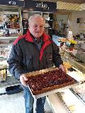 Am Tag des Besuches bei Uli Kohlhaas kam es noch zu einer besonderen Begegnung, die nur in einem dörflichen Bereich möglich ist…. Da fragte plötzlich der betagte Rentner Erwin Kempf, der jahrelang einen Fuhrbetrieb unterhielt, über die Ladentheke: „Ist der Kuchen fertig?“ „Na klar!“, kam die Antwort der Verkäufer und sie übergaben dem fast 90-Jährigen ein komplettes Blech mit Pflaumenkuchen, den er selbst belegt und nur zum Backen gebracht hatte. Auch solche Leistungen sind in der Nachbarschaftshilfe möglich. Der erste Versuch daheim war missglückt und nun konnte der Alleinstehende seinen Gästen einen „selbst gebackenen Kuchen“ servieren.