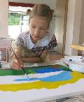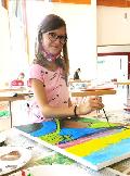 Bilder dieser Künstler (darunter bekannte Werke wie „Die Sternennacht“, „Der blaue See“ oder „Blaues Pferd I.“) wurden dann am zweiten Tag kreativ mit Acryl auf richtiger Leinwand gestaltet. Für Manche eine ganz neue Erfahrung! Bei deren Gestaltung bewegten sich die Kinder mehr oder weniger am Original, alle brachten eigene Impulse und kreative Elemente ein. Während ruhig und konzentriert gearbeitet wurde, interviewten Luzia und Tizian Holzbach die Kinder zu ihrer Bilderauswahl, ihren eigenen Ideen und ihrer Veränderungen der Bilder. Aber auch was sie in ihrer Freizeit mit Kunst verbindet war eine Frage.