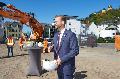 Patrick Bülling ist Bauleiter der Firma Gollwitzer, die die Tiefbauarbeiten durchführt. Er erläuterte, welche Arbeiten in nächster Zeit anstehen: Im ersten Schritt wird etwa zwei Meter tief ausgeschachtet, denn in dieser Tiefe werden Erdanker gesetzt. Diese Erdanker sichern die unterirdische Bohrpfahlwand, damit sie nicht in die Baugrube hineinrutschen kann. Die Verankerungen werden durch die Betonsäulen in das dahinterliegende Erdreich gebohrt. Sobald die Erdanker sitzen wird ausgebaggert - bis etwa fünf Meter tief dort, wo das Kellergeschoss sein wird. Diese Arbeiten sollen Mitte/Ende Oktober beendet sein: „Dann werden wir die Baugrube schlüsselfertig übergeben“, so Bülling mit einem Augenzwinkern. Mit einem „Fritten für alle“ lud er die Gäste zu einem Mittagsimbiss ein.