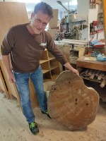 Bei einem Holzhändler in Krefeld entdeckte Vater Markus Windhagen diese Teakholzscheibe, die er seinem Sohn Marvin schenkte. Marvin stromert schon seit geraumer Zeit durch die heimischen Wälder auf der Suche nach einer geeigneten Holzscheibe, die sich als Tischplatte eignet. entsprechend begeistert war er über dieses Geschenk: eine Baumscheibe von einem circa 100-jährigen Teakholzbaum. Teak ist mittlerweile sehr teuer geworden (Kubikmeter-Preis etwa 10.000 Euro). Eine zweite Baumscheibe liegt bereits in der Schreinerei und wartet auf die Verwandlung in ein Zierstück für jeden Wohn- oder Bürobereich.