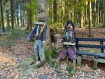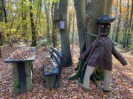 Birkenbeul. Am Parkplatz des Raiffeisenturms in Beul startet unsere kurze Wanderung. Es geht am Waldrand entlang, rechts immer mit einem guten Weitblick über Birkenbeul, bis man zum alten Sportplatz kommt. Dort bleibt man weiter auf der Straße und sieht nach circa 100 Metern einen breiteren Pfad rechts in den Wald. Dieser Weg führt uns zu einem Platz im Wald, an dem uns “Jäger Toni” erwartet. Eine große Holzpuppe, die mit Hut und Flinte ausgestattet an einem Baum lehnt. An diesem Ort war früher ein Stallplatz an der ehemaligen Kohlstraße. Ein Unterstellplatz für Vorspann- und Auswechseltiere von Pferden und Ochsen, welche zur Auswechslung und Fütterung der Zugtiere wegen der schwierigen Wegverhältnisse erforderlich war. Der alte Jörg, "ein Köhler aus dem Springerloch", soll den Kohlefuhrleuten gegen ein gewisses Entgelt Futter für die Zugtiere besorgt haben. Den "Köhler Jörg" finden wir einige Meter weiter im Wald in weiblicher Begleitung. Natürlich auch als Holzpuppen, die immer mal wieder neu angezogen werden.