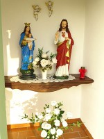 Zu einem Bildstock gehören natürlich auch Andachtsgegenstände. Diese fand man in Statuen vom Herz Jesu, gestiftet von Elfriede Schmidt (Schnapsbrennersch) sowie der Gottesmutter mit Jesuskind, die Gemeindereferentin Eva-Maria Henn zur Verfügung stellte. Zwei Engelsputten ergänzen das Ensemble.