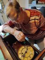 Brigitte betreibt im Nebenerwerb eine kleine Uhrmacherwerkstatt und ist für ihre treuen Kunden oft „die letzte Rettung“. Digitale Uhren und Billigprodukte der Wegwerfgesellschaft lohnen kaum zur Reparatur. Wer aber ein altes Schätzchen am Arm, in der Tasche oder an der Wand hängen oder im Wohnzimmer als Standuhr besitzt, der freut sich immer, wenn er bei Brigitte Schmitz Hilfe findet und dabei die alte Kirchturmuhr an der Wand bewundern kann. repa