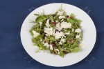 Rucola-Salat waschen und auf Küchenpapier trocknen. Anschließend in einer Salatschüssel mit etwa 2 Esslöffel Olivenöl und 3 Esslöffel Weinessig vermischen. Die Walnusskerne mit Granatapfelkernen dazu geben. Noch einmal durchmischen und auf Tellerchen verteilen. Parmesanspäne obenauf streuen.