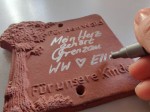 Dann übernimmt Nicole Thoss vom Keramik Kasino, die alle Täfelchen brennt, ebenfalls ohne Rechnung. Anschließend geht es zurück in die „Zweite Heimat“ zur Beschriftung – das übernimmt Petra Litt - jedes einzelne Stück, sauber und ordentlich. In diesem Prozess, so 20 Minuten Handarbeit pro Keramik, packen auch Karin, Marianne, Christian und Werner immer mal wieder an, transportieren, koordinieren.